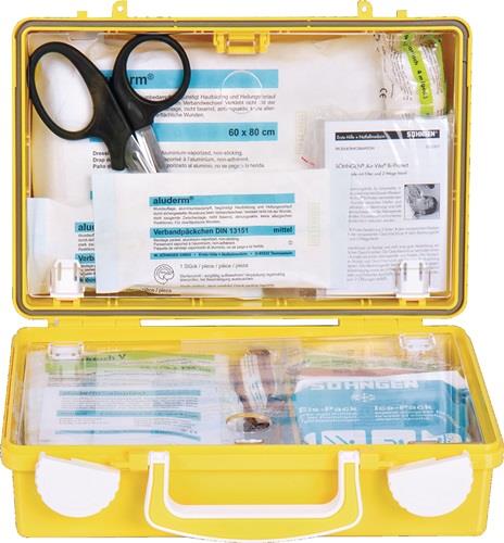 mobil und stationär einsetzbar · leuchtgelb · inkl. Wandhalterung mit 90°-Stopp-ArretierungDieser Koffer ist nach DIN 13157-2021 – mit Zusatzbefüllung!