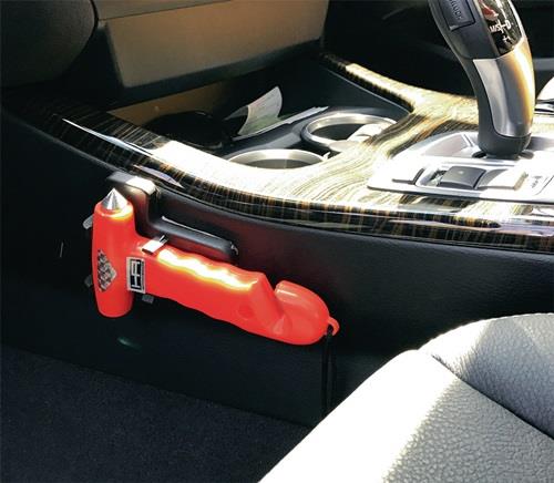 mit Gurtmesser · aus robustem Kunststoff, mit Reflektoraufkleber · Hammerspitze aus spezial gehärtetem Stahl · Gurtmesser im Griff · schnell zur Hand durch mitgelieferte Halterung · Befestigungsmaterial nicht enthalten · von der deutschen Verkehrswacht empfohlen · SB Verpackung